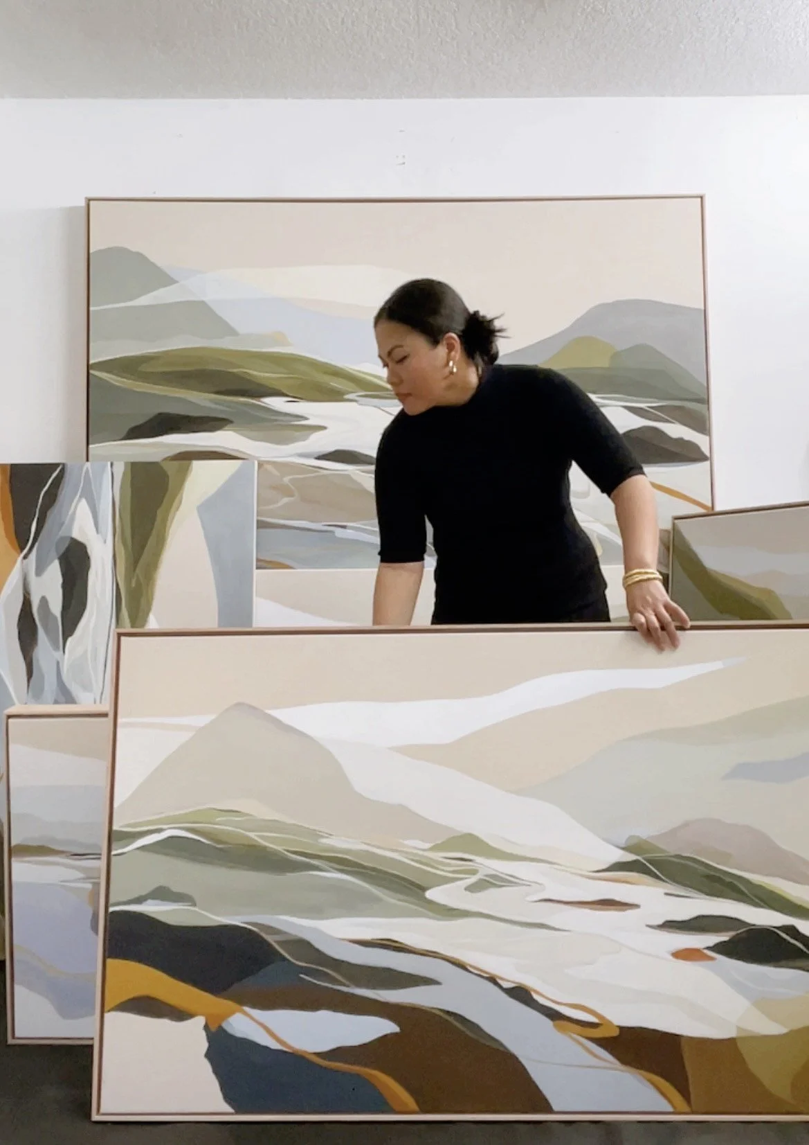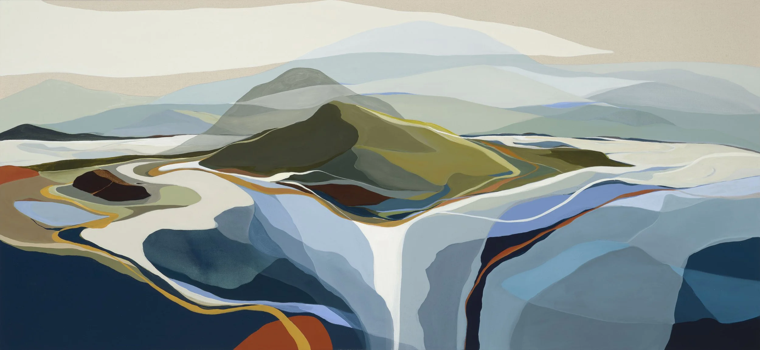 Ethel Voronkova’s studio practice is driven by an exploration of the subconscious through stylized abstraction. Working primarily with acrylics on raw canvas, she creates dreamscapes that evoke the ephemeral nature of thought and memory. Through fluid landscapes and layered forms, her work captures fleeting moments where reality bends into the intangible—spaces that feel both familiar and otherworldly. She explores how colour and form can hold the essence of something elusive, offering a glimpse into the transient terrain of dreams.